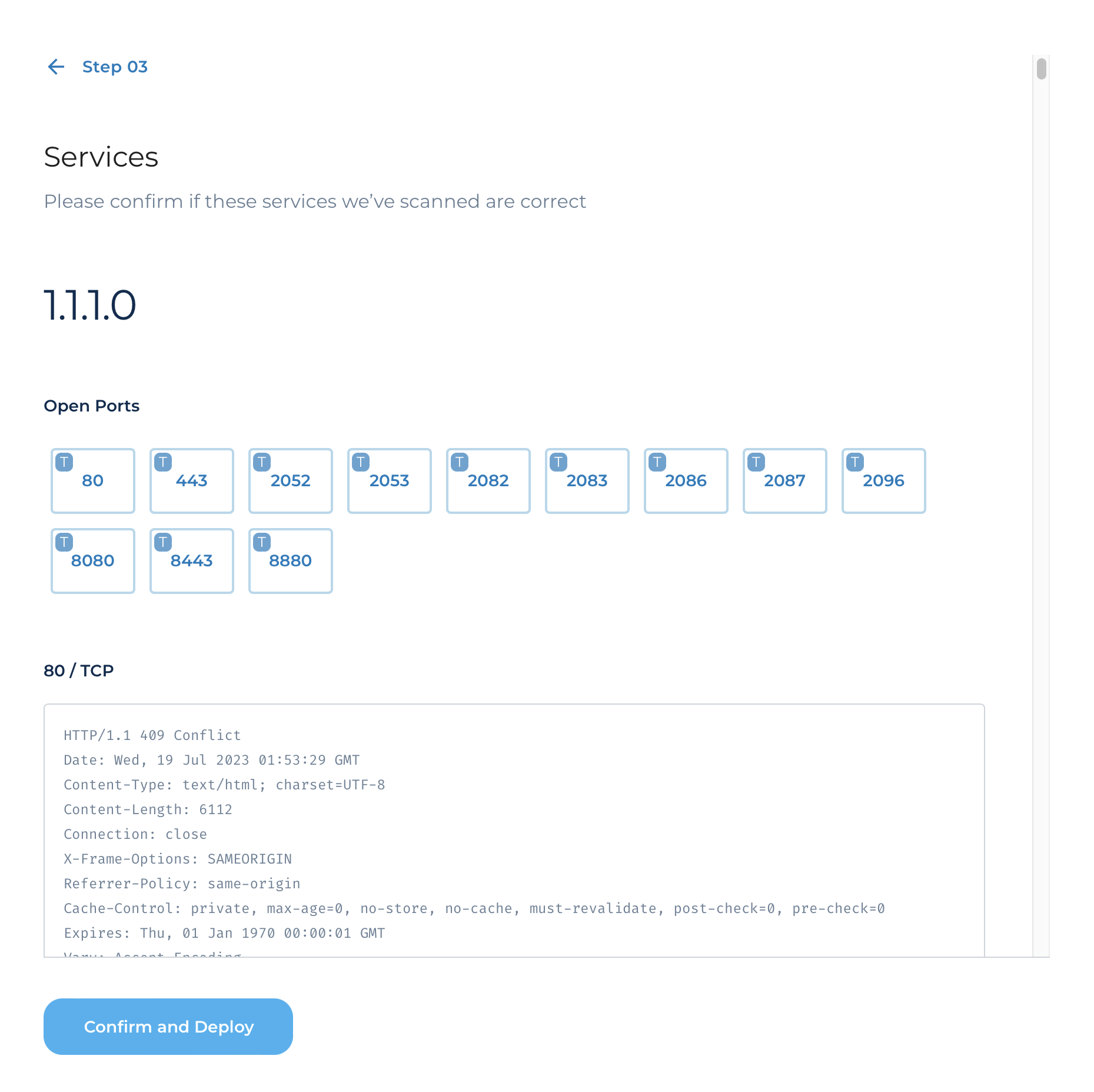 This step will show you a list of open ports and service banners for your network. This helps you confirm the network perimeter you want to protect.